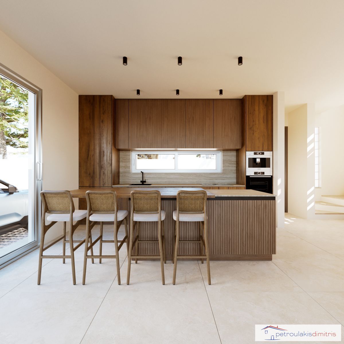 Η κουζίνα θα εξοπλιστεί με ντουλάπια λάκας και πάγκο από μάρμαρο Καβάλας.