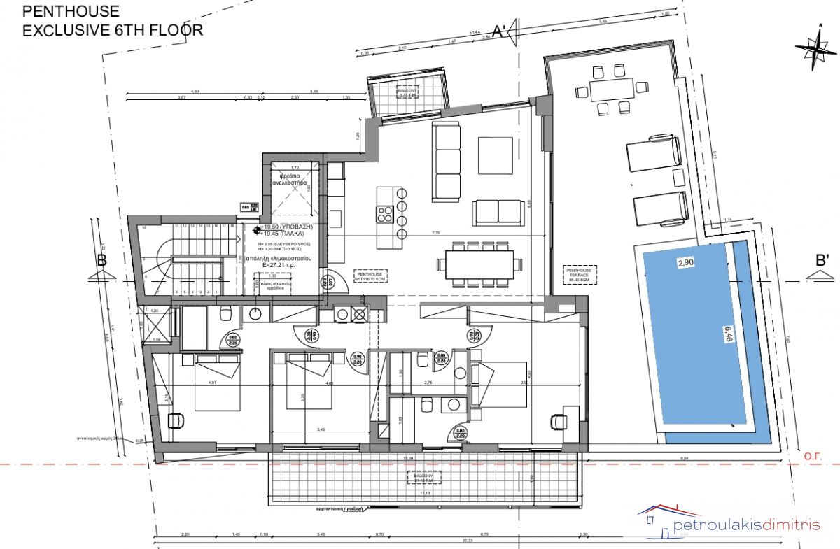 Το διαμέρισμα βρίσκεται στον 6ο όροφο και έχει καθαρή επιφάνεια 136 τ.μ., νότιο μπαλκόνι 21 τ.μ., ευρύχωρη βεράντα 86 τ.μ. και ιδιωτική πισίνα 19 τ.μ.