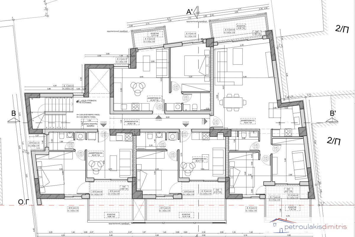 Διαμέρισμα 5ου ορόφου (Ε3) μικτής επιφάνειας 44.64 τ.μ., καθαρής επιφάνειας 36.07 τ.μ. και επιφάνειας μπαλκονιού 16.49 τ.μ.